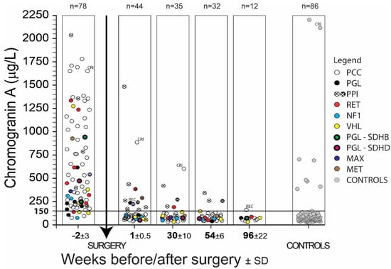 A sampling of biological materials was performed preoperatively (2 ± 3 weeks before surgery) and about one week (1 ± 0.5 weeks), six months (30 ± 10 weeks), one year (54 ± 6 weeks) and two years (96 ± 22 weeks) after surgery. A blood basal sampling was performed 20 min after the introduction of cannula in supine position. Four collections (before surgery, one week, six months, one year after surgery) were conducted in 27 patients (25 PCC, 2 PGL); 19 blood samplings were from patients treated with proton pump inhibitors. Three collections (before surgery, one week, six months after surgery) were from seven PCC patients, in which four samplings were from patients treated with PPI and one patient suffered from chronic renal insufficiency (CRI). Three collections (before surgery, one week, one year after surgery) were from one PCC and one PGL patient, one sampling of PGL patient was treated with PPI. Two collections (before surgery, one week after surgery) were from six PCC patients and two PGL patients, three samplings were from patients treated with PPI, one PGL patient had a recurrence of the disease (REC). Two collections were in one patient (before surgery, six months after surgery), two collections (before surgery, one year after surgery) were from three PCC patients. Two collections were in 10 PCC patients and two PGL patients (before surgery, two years after surgery), two PCC patients had REC of the disease. One collection was in 15 PCC patients and three PGL patients before surgery.
