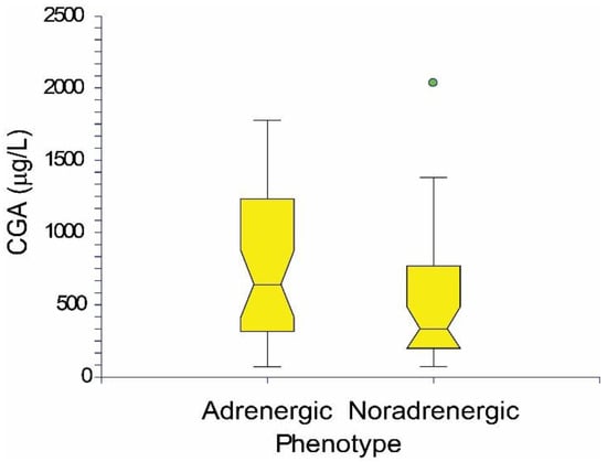 PPGL patients are divided into PCC and PGL groups (total, males, females) with specified or not specified mutations in Table 1. Six of the PCC patients (none of the PGL patients) were metastatic (1 case of RET mutation, other mutations were not specified), two of these patients died prior to surgery. Nine PGL patients with preoperative CGA concentrations 355.9 ± 270.8 µg/L (Table 1) showed only noradrenergic phenotype with increased NMN and normal MN with one exception in which both MN and NMN were normal. Preoperative CGA concentrations 657.1 ± 492.7 µg/L (Table 1) were found in 62 PCC patients. According to Eisenhofer et al. [], there was an adrenergic phenotype with elevated MN and variable NMN levels in 36 patients with a CGA concentration equal to 767.7 ± 513.7 µg/L. A noradrenergic phenotype with elevated NMN and normal or slightly increased MN to 120 μg/L was found in 25 patients with a CGA concentration of 516.9 ± 428.8 µg/L. Both MN and NMN were in normal reference ranges in one PCC patient. In general, the adrenergic phenotype of PPGL patients did not have a statistically significantly higher concentration of CGA than the noradrenergic phenotype. The CGA concentration of the adrenergic and noradrenegic phenotype is shown in Figure 2 as the notched box plot.