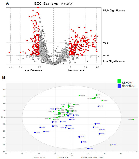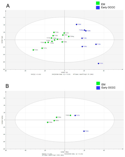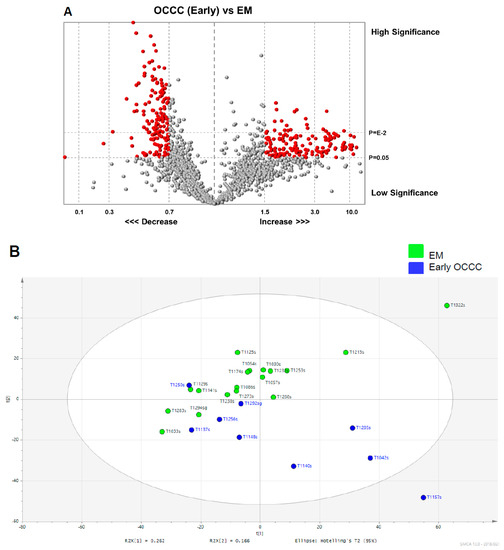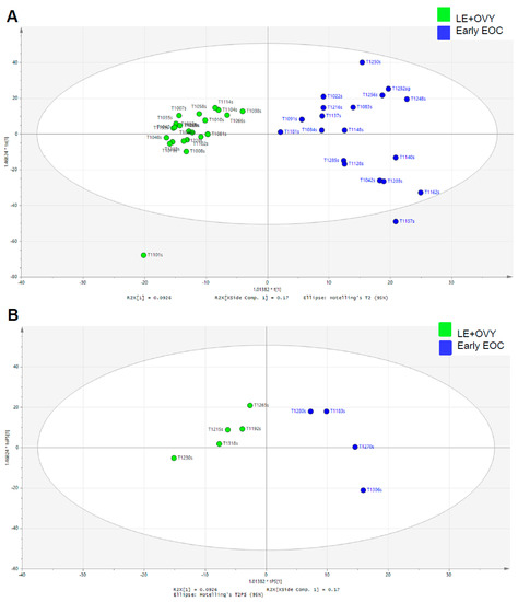 The validation was performed to assess the predictive ability of the corresponding OPLS-DA model with the calculated output (R2X = (0.37), R2Y = (0.74), Q2 (cum) = (0.44)). Although it did not quite reach the cutoff value for reliable model due to the limited sample size, the result of this subgroup analysis was surely suggestive for the validation of the main study cohort (Q2 > 0.5; Supplementary Figure S1B). The additional external validation set for the endometrioma was correctly localized to the same region as the endometrioma training set, and equivalent results were obtained using the early-stage OCCC testing set (Figure 5B).