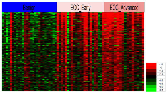 The heat map in Figure 3 shows that the spectra of 300 glycoproteins chosen as an example from the other 2281 peaks on the basis of p-values in a t-test can differentiate between most patients with EOC (early and advanced) and the leiomyoma and ovarian cyst non-cancer patients. The heat map was constructed by first calculating the averages of the control group (leiomyoma and ovarian cyst) for each glycopeptide. Next, the ratio between each individual’s level and the average was calculated.