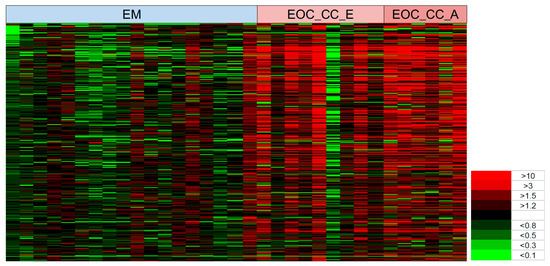 Heat map of glycopeptides in the blood sera of early OCCC, advanced OCCC and endometrioma patients. The Y-axis represents 300 individual glycopeptides in the MS spectra and the X-axis represents the individual patients in endometrioma, early OCCC, and advanced-stage OCCC patient groups. The spectral colors in the matrix represent the ratio level of glycopeptide peaks in the individual compared to the average level in the non-cancer group ranging from the brightest green (<0.1) to the brightest red (>10). Abbreviation: OCCC, ovarian clear cell carcinoma; EM, endometrioma; EOC_CC_E, early-stage OCCC; and EOC_CC_A, advanced-stage OCCC.