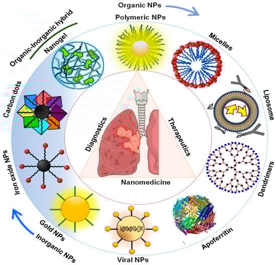 29]. Apart from that, due to good biocompatibility and the capability of overcoming clearance by the kidney effacing long circulation nanoparticles holds edge over conventional therapeutic treatments. Moreover, several nanoparticles displayed multifunctional abilities like imaging, diagnostics, therapeutics, sensing that helps researchers to utilize these nanomaterials for multifunctional biomedical applications in lung cancer theranostics. Here in this review, we have focused on the theranostics applications of various types of nanomaterials that have shown enormous promise for the applications in lung cancer diagnosis and therapy including (a) liposomal nanoparticles, (b) polymeric nanoparticles, (c) bio-nanoparticles, and (d) metal nanoparticles (