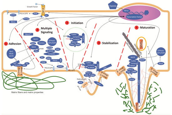 Moreover, other mechanisms of regulation have been reported. Thus, miRNA143 and miRNA145 can negatively regulate podosome formation, although their role in invadopodium formation has not been established [44]. In addition, NOX activation and reactive oxygen species (ROS) induction can regulate podosome and invadopodium formation [62]. Another protein that participates in invadopodium regulation is the cancer-related isoform of mammalian enabled protein (MENAinv). MENAinv seems to induce invadopodium activity, enhancing its sensitivity to EGF as well as the phosphorylated status of cortactin. As a result, the invasiveness of cancer cells is increased [63].
