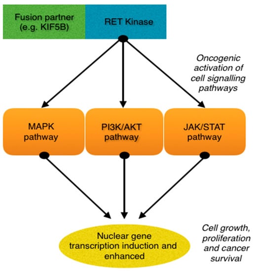 RET fusions rather than mutations are typically present in non-small cell lung cancer (NSCLC). A number of RET fusion partners have been described, however the most common variant in NSCLC is the KIF5B fusion partner [8]. KIF5B is reported in 50–70% of RET fusion positive cases of NSCLC. Other fusion partners such as CCDC6 and NCOA4 have been described, but are present less frequently [9,10]. When a fusion partner is present in combination with RET, this results in activation of the oncogenic tyrosine kinase domain of RET [11]. Subsequently, this leads to autophosphorylation of RET and downstream cell signalling through intracellular pathways such as the mitogen-activated protein kinase (MAPK), PI3K/AKT and Janus kinase/signal transducer and activator of transcription (JAK/STAT) pathways (Figure 1). RET fusions behaving in this manner result in oncogenic activation promoting unchecked cellular proliferation [12,13].