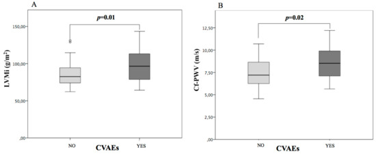 Cardiovascular organ damage in patients with and without cardiovascular adverse events during follow up. LVMi = left ventricular mass indexed to body surface area (A); cf-PWV = carotid-femoral pulse wave velocity (B). CVAEs = cardiovascular adverse events.
