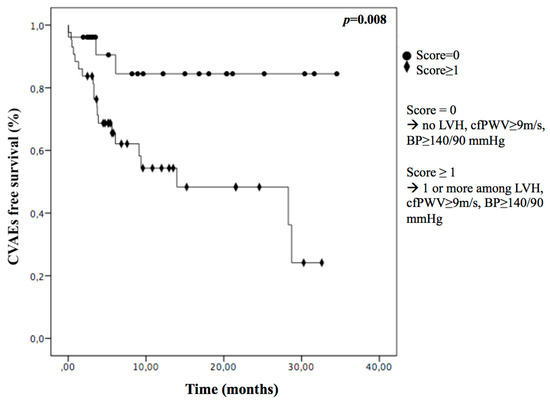 Finally, we found the presence of at least one of these conditions (LVH, cf-PW ≥ 9 m/s, BP ≥ 140/90 mmHg) was sensitive in recognizing who would experience CVAEs (Figure 2): we assigned a score to each patient based on the presence (score = 1) or absence (score = 0) of each parameter and we saw a significantly lower incidence of CVAEs in patients with a score = 0 (12%) compared to patients with a score ≥ 1 (47%), p = 0.008.