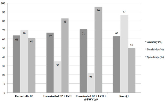 Sensitivity, specificity and accuracy of clinical and cardiovascular parameters. BP = blood pressure; LVH = left ventricular hypertrophy; cfPWV = pulse wave velocity; Score ≥ 1 = patients with 1 or more among BP ≥ 140/90, LVH, cf-PWV ≥ 9 m/s.