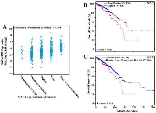 Frequency of StAR CNA data in breast cancer tumors and its correlation to overall survival. StAR CNA data were obtained from TCGA breast cancer tumor datasets with 1080 tumors. The CNA level was categorized as homozygous deletion, hemizygous deletion, diploid, gain, and high level amplification (A), utilizing cBioPortal browser, as described under Section 2. Breast cancer RNA-Seq data were assessed for StAR mRNA expression that positively correlated with StAR CNA data in different categories (A), which were presented in Y-axis and X-axis, respectively. Amplification of the StAR gene was evaluated for overall breast cancer survival (B,C). Kaplan-Meier curve was generated with TCGA breast cancer tumor CNA data, using with amplification (138 tumors) vs. without amplification (diploid, 406 tumors; B), or with a category (926 tumors; C) excluding homozygous deletion (16 tumors) of the StAR gene. Red and blue lines in panels B and C represent with and without amplification of the StAR gene, respectively.