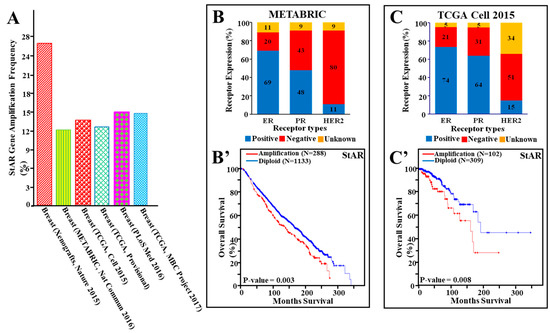 In additional analyses, ER, PR, and HER2 expression, amplification of the StAR gene and its correlation to overall survival, were evaluated. In METABRIC study, breast cancer tumors (2173 tumors) were 69% ER+, 48% PR+, and 80% HER−, representing a mixed subtype, in which amplification of the StAR gene (~12%) affected the survival (p-value = 0.003) of breast cancer (Figure 3B,B’). In a breast invasive carcinoma study (Cell 2015, 816 tumors), amplification of the StAR gene (~14%), associated with 74% ER+, 64% PR+, and 51% HER2− (15% HER2+), was found to correlate (p-value = 0.008) with poor breast cancer survival (Figure 3C,C’). These data corroborate the findings presented in Figure 2B,C, and demonstrate that amplification of the StAR gene is correlated with poor survival of patients with luminal subtype breast cancer. Survival data were not available for other studies included in Figure 3A.