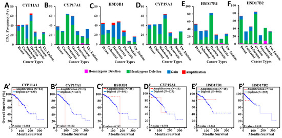 The amplification of these steroidogenic enzyme genes in breast cancer survival was next evaluated. As determined by Kaplan-Meier survival analyses, amplification of the CYP11A1 gene was not associated (p-value = 0.984) with breast cancer survival (Figure 4A’). Similarly, both CYP17A1 and HSD3B1 gene amplifications were not found to affect the survival of breast cancer, in which p-values were 0.103 and 0.262, respectively (Figure 4B’,C’). Kaplan-Meier survival analysis revealed that amplification of the CYP19A1 gene was not correlated (p-value = 0.756) with breast cancer survival (Figure 4D’). Additionally, amplification of both HSD17B1 and HSD17B2 gene isoforms did not affect the survival of breast cancer, where p-values were 0.861 and 0.618, respectively (Figure 4E’,F’). These data indicate that none of these steroidogenic enzyme genes were either substantially amplified or affected the survival of ER+/PR+ breast cancer.