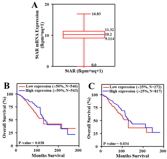 To better understand the involvement of StAR in breast cancer, TCGA breast cancer tumors expressing StAR mRNA were verified for survival analyses with two different quartile combinations. As depicted in Figure 5B, Kaplan-Meier curve generated with StAR mRNA values up to 50th percentile (<10.2) as low and above 50th percentile (>10.2) as high [46], was found to correlate with poor survival (p-value = 0.038) of patients with breast cancer. In a different category, StAR mRNA values up to 25th percentile (<9.114) as low and above 25th percentile (>9.114) as high [48], showed qualitatively similar effect (p = 0.034) on the survival of breast cancer (Figure 5C). These data suggest that higher expression of StAR mRNA can be a risk factor for poor survival of patients with breast cancer.