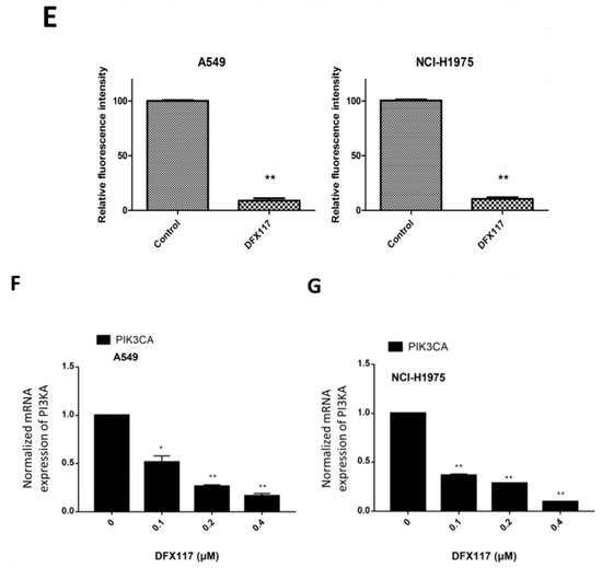 To further elucidate the anticancer mechanism of DFX117, the regulation of PI3K signal transduction pathway associated with cancer cell growth was analyzed using Western blot analysis. After DFX117 treatment for 24 h, the protein levels of PI3K signaling pathways including p-Akt, p-mTOR, p-p70S6K, p-GSK3β, p-4EBP1 and p-eIF4E were effectively suppressed in both A549 and NCI-H1975 cells (Figure 2A,B). In contrast, the expression of PTEN, a tumor suppressor was enhanced by the treatment of DFX117 in both cells (Figure 2A,B). The suppressive effect of DFX117 on p-Akt expression was also manifested by observation of immunofluorescence analysis under a confocal microscope after treated with DFX117 (0.2 µM) for 8 h in A549 (Figure 2C) and NCI-H1975 cells (Figure 2D,E). Interestingly, DFX117 effectively suppressed the expression of mRNA of PIK3CA in a concentration-dependent manner, which is different from other PI3K kinase inhibitors (Figure 2F,G).
