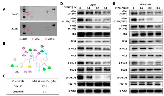 Phosphorylated RTKs were measured with the Human Phospho-RTK Array Kit (ARY001B) from R&D Systems (Minneapolis, MN, USA) according to the manufacturer’s instructions. A total of 250 μg of lysates from the A549 cells treated with DMSO or DFX117 for 8 h were subjected to analysis.