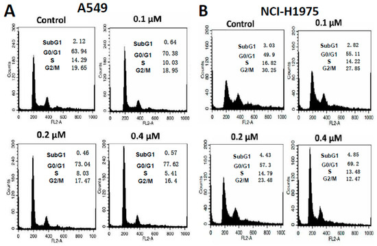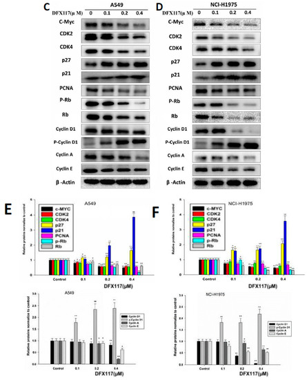 It is well-known that the PI3K and Met signaling pathways are highly associated with the regulation of cell cycle checkpoints in cancer cell proliferation. To further evaluate the effects of DFX117 on the cell cycle regulation, the cells were treated with DFX117 for 24 h, and cell cycle distribution was detected by FACS analysis. DFX117 induced cell cycle arrest at the G0/G1 phase in a concentration-dependent manner compared to that of the control groups in both A549 and NCI-H1975 cells (Figure 4A,B). The effects of DFX117 on cell cycle regulation were further confirmed by Western blot analysis. As shown in Figure 4C,D, the phospho-cyclin D1 at Thr286, which enhanced ubiquitination and proteasomal degradation of cyclin D1, was increased by DFX117 with a decrease in cyclin D1. In addition, the expression levels of c-Myc, CDK2/4, cyclin E, cyclin A, Rb and p-Rb were significantly suppressed, but the stabilization of p27 and p21 expression levels was upregulated by DFX117 treatment for 24 h in a concentration-dependent manner (Figure 4C–F). These findings suggest that the anti-proliferative activity of DFX117 in cancer cells is in part correlated with the induction of G0/G1 cell cycle arrest via its regulation of the expression levels of proteins in the PI3K/Akt and c-Met pathways.