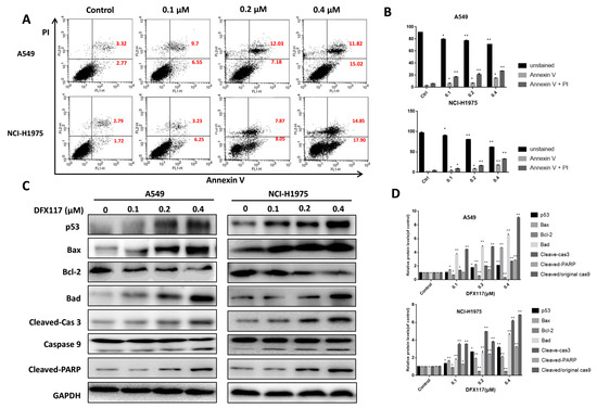 To further evaluate whether DFX117 is able to induce apoptotic cell death after an extended exposure time in lung cancer cells, the cells were treated with DFX117 for 48 h, and Annexin V-positive cells were detected by FACS analysis. As shown in Figure 5A,B, the population of apoptotic cells (Annexin V positive) was increased in a concentration-dependent manner in both A549 (from 6.09% to 26.84% at 0.4 μM DFX117) and NCI-H1975 (from 4.15% to 32.75% at 0.4 μM DFX117) cells. These data indicated that the longer exposure of DFX117 induced apoptotic cell death in both lung cancer cell lines. To further clarify the molecular mechanisms involved in the induction of apoptosis by DFX117, the effect of DFX117 on the expression levels of apoptosis-associated proteins was examined by Western blot analysis after treatment with DFX117 for 48 h in A549 and NCI-H1975 cells. In comparison to the vehicle-treated control group, the p53, Bax and Bad expressions were upregulated by DFX117 treatment, and the anti-apoptotic protein Bcl-2 was downregulated (Figure 5C,D). DFX117 also triggered the activation of the caspase-dependent apoptotic cascade. The cleaved caspase-9 and cleaved caspase-3 expressions were remarkably increased when treated with DFX117 at 0.4 μM, and subsequently elevated the expression level of cleaved PARP in both A549 and NCI-H1975 cells (Figure 5C,D). Taken together, these data suggested that DFX117 induced apoptotic cell death via the caspase (intrinsic) pathway in A549 and NCI-H1975 cells.