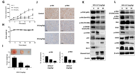 The antitumor activity of DFX117 was further determined in a nude mouse xenograft model implanted with A549 (3 × 106 cells/mouse) and NCI-H1975 human lung cancer cells (7 × 106 cells/mouse). When the tumor volume reached approximately 100 mm3, DFX117 (5, 10 or 20 mg/kg) was orally administered daily for 23 days in A549 xenograft model. At the termination of the experiment (30 days after inoculation), the tumor volumes in the vehicle (normal saline)-treated control group were approximately 1100 mm3. Compared to that of the control group, tumor growth was significantly inhibited by DFX117 treatment. The inhibition rates of the tumor volume relative to the control group were 48.1%, 67.3% and 79.9% at 5 mg/kg, 10 mg/kg and 20 mg/kg DFX117, respectively, in A549 cells-implanted xenograft model (Figure 6A). No overt toxicity or body weight change was observed with DFX117 administration (Figure 6B). The excised tumor weights on the termination day were also significantly inhibited by DFX117 treatment (Figure 6C). Similarly, in NCI-H1975 xenograft model, the inhibition rates of the tumor volume relative to the control group were 52.0% and 81.89% at 10 mg/kg and 20 mg/kg DFX117 treatment, respectively (Figure 6G). No overt toxicity or body weight change was observed, and the tumor weights were found to be significantly inhibited by DFX117 administration in NCI-H1975 cells-implanted nude mouse models (Figure 6H,I). These data indicated that the oral administration of DFX117 exerted a potential antitumor activity without toxicity in animal models. In addition, immunohistochemical analysis of tumor tissues showed that administration of DFX117 effectively suppressed the expressions of p-Met and p-Akt (Figure 6D,J). The expression level of cleaved caspase-3 was remarkably increased, and effectively suppressed the expression of Ki67 which is a cell proliferation marker, in the DFX117 treatment group compared to vehicle-treated control groups (Figure 6D). We also confirmed the effects of DFX117 on mRNA levels of PIK3CA in tumors. In accordance with the in vitro results, mRNA levels of PIK3CA were dose-dependently decreased in DFX117-treated tumors (Appendix A). In addition, the protein expression levels of p-Met, Grb2, p-GSK3β, p-mTOR, p-STAT3 and p-ERK1/2 were also downregulated by DFX117, suggesting that the Met and PI3K/Akt signaling pathway was inhibited by DFX117 in the in vivo model (Figure 6E,F). The change in the expression levels of proteins related to apoptotic cell death, including p53, Bax, cleaved caspase-9, caspase-3, PARP and Bcl-2, in the tumor tissues was also consistent with the findings from the in vitro cell culture system (Figure 6E,F). Overall, these data suggested that DFX117 effectively inhibited the tumor growth of lung cancer cells in vivo and that the antitumor activity of DFX117 might be partly associated with the downstream regulation of the Met/PI3K/Akt pathway. As shown in Figure 6K,L, the protein expression levels of p-Met as well as its downstream components such as Grb2, p-GSK3β, p-mTOR, p-STAT3 and p-4ERK1/2 were also downregulated by DFX117, suggesting that the Met and PI3K/Akt signaling pathway were in part involved in the antitumor activity of DFX117 in the NCI-H1975 cells-implanted xenograft model.