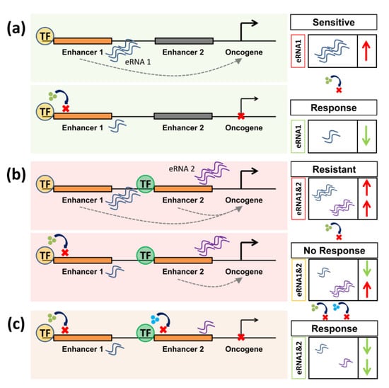 Enhancer RNAs (eRNAs) are putative biomarkers for responsiveness and resistance in perturbation of enhancer activity. (a) In a responsive context, inhibiting an enhancer leads to a decrease in the activity of oncogenic target genes. In this case, high levels of eRNA can predict responsiveness to a specific inhibitor by providing a direct readout of enhancer activity. (b) In case of resistance, compensating mechanisms such as the activation of a different enhancer program can occur. Thereby, high levels of different eRNAs can predict resistance to a certain therapy. (c) To re-sensitize cells, compensatory mechanisms should also be targeted to ensure therapeutic success.