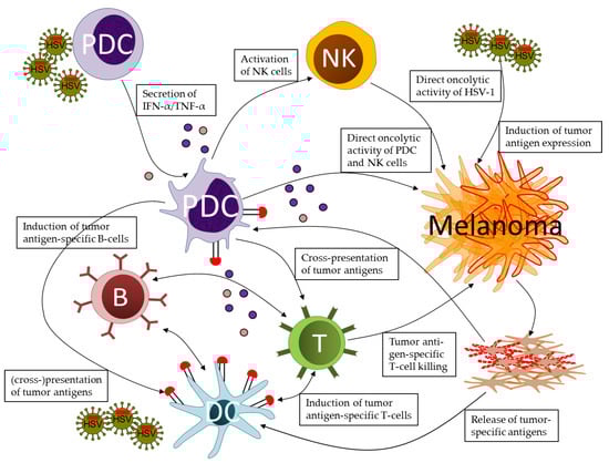 The major type I interferon-producing plasmacytoid dendritic cells (pDC) surround and infiltrate certain tumors like malignant melanoma, head and neck cancer, and ovarian and breast cancer. The presence of pDC in these tumors is associated with an unfavorable prognosis for the patients as long as these cells are unstimulated. Upon activation by synthetic Toll-like receptor agonists or viruses, however, pDC develop cytotoxic activities. Viruses have the additional advantage to augment cytotoxic activities of pDC via lytic replication in malignant lesions. These effects turn cold tumors into hotspots, recruiting further immune cells to the site of inflammation. Activated pDC contribute to cross-presentation of tumor-associated antigens by classical dendritic cells, which induce cytotoxic T-cells in particular in the presence of checkpoint inhibitors. The modification of oncolytic herpes viruses via genetic engineering favorably affects this process through the enhanced production of pro-inflammatory cytokines, curbing of tumor blood supply, and removal of extracellular barriers for efficient viral spread. Importantly, viral vectors may contribute to stimulation of memory-type adaptive immune responses through presentation of tumor-related neo- and/or self-antigens. Eventually, both replication-competent and replication-deficient herpes simplex virus 1 (HSV-1) may serve as vaccine vectors, which contribute to tumor regression by the stimulation of pDC and other dendritic cells in adjuvant and neo-adjuvant situations.