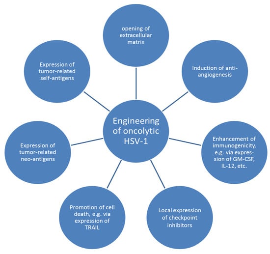 Prospects of optimizing anti-tumor activities via genetic engineering of oncolytic herpes simplex viruses 1 (HSV-1). HSV-1 can be designed to express proteins which modify the tumor environment, e.g., via restricting blood supply of the tumor, reducing barriers for efficient viral spread, enhancing influx of immune cells through production of pro-inflammatory cytokines, and/or contributing to local increase of immune cell activity. Engineered HSV-1 may also promote tumor cell lysis via expression of apoptosis-inducing ligands or stimulate different cells of the adaptive immune system as vaccine vector presenting neo- or self-antigens. Adapted according to [86].