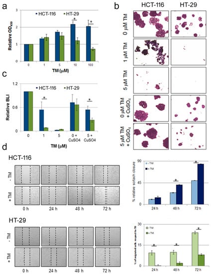 In the current manuscript, we evaluated the effects of Cu depletion achieved by pharmacological treatment with the specific chelating agent tetrathiomolybdate (TM), currently used for the treatment of Wilson’s disease [15], in BRAFV600E colorectal cancer cells in vitro and in vivo.