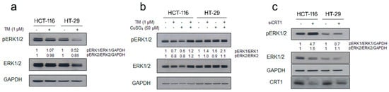 BRAFV600E is referred to as class I mutant [4], a group of BRAF mutations giving rise to stronger activation of BRAF kinase activity and constitutive activation of the MAPK pathway compared to the wild type counterpart [5]. Intriguingly, MEK1 phosphorylation of ERK1/2 is enhanced by copper availability [9]. As a result, BRAFV600E-driven signaling and tumorigenesis are reduced either by MEK1 mutations which disrupt Cu binding or decreased cellular copper uptake [10]. In the light of these considerations, we assayed the ability of TM treatment to influence signal transduction through the Raf1/MEK/ERK pathway in colon cancer cells bearing different status of BRAF. In particular, by immunoblot analysis we examined the phosphorylation status of ERK1/2, the mitogen-activated protein kinases involved in the signal transduction cascade that leads to cell proliferation, in cells treated with TM. The level of phosphorylated ERK1/2 kinases in BRAFV600E colon cancer HT-29 cells decreased significantly during incubation with TM (Figure 2a). Moreover, a slight reduction of total ERK proteins was also determined in the same cell line. In contrast, no reduction was observed under copper chelation treatment in BRAFwt cells (Figure 2a). Conversely, copper supplementation in HT-29 cells treated with TM rescued the pERK1/2 decrease observed upon TM treatment alone, while a further increase in the phosphorylation level of ERK1/2 was observed in HCT-116 cells (Figure 2b). We further investigated the role of cellular copper content in BRAFV600E driven tumorigenesis by reducing the Cu influx through knockdown of the high-affinity Cu-transporter CRT1 (Figure 2c). In accordance with the effects observed upon pharmacological copper chelation by TM, CRT1 silencing could also affect MAPK pathway activation. The BRAFV600E cells with reduced expression of CRT1 exhibited reduced phosphorylation of ERK1/2 (P-ERK1/2), while robust activation was induced in HCT-116 cells under the same experimental conditions. Thus, BRAFV600E requires the copper transport function of CTR1 for increased signaling and tumorigenesis.