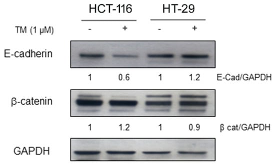 Modulation of the adhesion protein E-cadherin has been associated to the progression of various epithelial tumors. To assess whether copper chelation could affect E-cadherin expression in BRAFV600E mutant cells and in their wild type counterpart, HT-29 and HCT-116 colon cancer cell lines were treated with TM (1 µM), the same concentration at which we observed pERK1/2 modulation. After 72 hours, TM significantly decreased the expression of E-cadherin in HCT-116 cells whereas an increase was observed in HT-29 cells (Figure 3), thus suggesting that the increased proliferation rate of HCT-116 cells treated with TM could be associated with a more aggressive tumor phenotype and increased tumor cell invasiveness. Conversely, no changes were revealed on the expression of the adhesion molecule β-catenin in both cell lines.