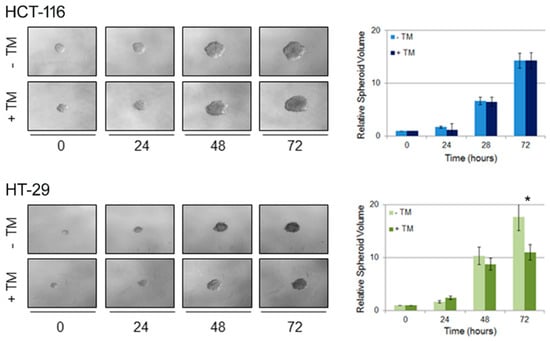 To generate 3D spheroids [18], HCT-116 and HT-29 colon cancer cells were diluted to obtain a cell density of 1.0 × 104/mL or 0.5 × 104/mL, respectively, then 200 µL/well were seeded into ultra-low attachment cell culture dish (96 well). Four days after seeding, spheroids (approximate size 300–500 µm) were formed and then embedded into Matrigel. To this aim, 100 µL of growth medium were removed and replaced with 100 µL of Matrigel on maintained on ice, then incubated at 37 °C to allow the Matrigel to solidify. After 1 hour, 100 µL of fresh medium were added and spheroids were then treated with TM for the indicated duration. Spheroids proliferation was followed with images captured every 24 hours. Spheroid volume was estimated by the formula: V = a × (b2)/2, where a and b are spheroid length and width, respectively.