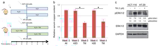 At necropsy, tumors were excised. The effect of systemic copper depletion on the phosphorylation state of ERK1/2 was determined by immunoblot analysis performed on tumor lysates. In agreement with the experiments performed on cultured cells in vitro, we also observed in tumor tissue derived from cells inoculated in vivo a similar reduction in the ratio of phospho/total ERK1/2 in HT-29 TM treated specimens, whereas in HCT-116 this ratio was increased as in the in vitro assays (Figure 5c).