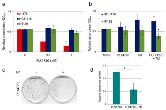 Effect of TM treatment on BRAF inhibitor resistant cells. (a) Melanoma and colon cancer cell lines show different sensitivity to PLX4720 treatment. Melanoma cell line A375 (BRAFV600E), colon cancer HCT-116 (BRAFwt) and HT-29 (BRAFV600E) were treated with the increasing doses of PLX4720. After 48 hours of treatment, cell survival was quantified using the WST-1 cell proliferation assay kit. (b) Combination therapy of PLX4720 and TM affects BRAFV600E colon cancer cell proliferation. HCT-116 (BRAFwt) and HT-29 (BRAFV600E) were treated with PLX4720 1 µM or TM 10 µM alone or in combination. After 24 hours of treatment, cell survival was quantified using the WST-1 cell proliferation assay kit. c) TM treatment affects clonogenic ability of BRAF mutant colon cancer cells resistant to PLX4720. PLX4720-resistant colon cancer HT-29 cells were established by continuous exposure to step-wise increasing concentrations of PLX4720, from 0.1 µM to 4 µM, until the surviving cells reached 90% confluence. Response to combination treatment with PLX4720 and TM was evaluated by clonogenic assay in HT-29-PLX4720- resistant cells. The medium was changed every 3–4 days and after 10 days grown colonies were stained with crystal violet (c) and quantified by densitometric analysis (d). Results are reported as means ± standard deviation of three independent experiments. * p < 0.05.