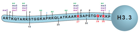 The amino terminal tail of histone H3.3. Commonly mutated sites are marked in red (K27, G34, K36) and the sites of modification are depicted as ‘me’—methylation, ‘ac’—acetylation, ‘P’—phosphorylation, and ‘i’—isomerization.