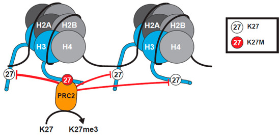 The H3K27M mutation was first identified by genomic sequencing efforts in ~30% of pHGG, arising in the midline and affecting the thalamus, the basal ganglia, and the spinal cord [5,6,39]. The K27M mutation primarily occurs in H3F3A (>70%), one of the two genes encoding H3.3, with a low frequency occurrence in H3.1 encoded by HIST1H3B or HIST1H3C, and rarely in H3.2 (HIST2H3C) [5,6,40,41]. A particularly aggressive form of these tumors arises in the brain stem or the pons and is called Diffuse Intrinsic Pontine Glioma (DIPG). The K27M mutation is present in 80% of cases of DIPG, and these children have an expected survival rate of around 10% at 2 years following diagnosis [42]. In 2016, the world health organization classified K27M tumors as a distinct entity—“Diffuse midline glioma, H3K27M” [43]. The restriction of the K27M mutation to tumors arising in a certain region of the brain, suggests that K27M mutation might only provide a selective advantage for cell proliferation and transformation in a subset of cells, in a specific developmental context. This idea has been supported by several studies showing that a combination of drivers, including H3K27M, is necessary to drive tumorigenesis. Mutations in TP53 and PDGFRA (platelet derived growth factor alpha) are often found to be associated with H3.3K27M in DIPGs, while H3.1K27M is most often associated with mutations in ACVR1 (activin A receptor type 1) and BCOR (BCL6 corepressor) [5,40,44,45,46,47,48]. Although most studies of H3K27 mutations focus on its role in pHGG, mutations of H3K27 have also now been identified in adult cancers, including acute myeloid leukemia, melanoma, and glioma [8,13,49]