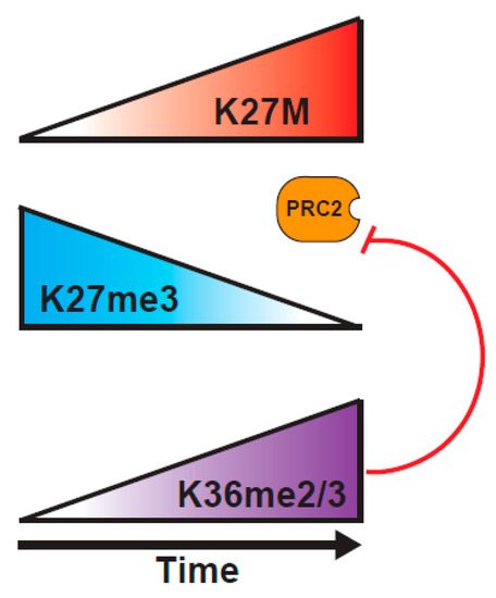 A study from the Reinberg lab probed the H3K27M mechanism of action, using a combination of biochemical approaches, and an inducible H3K27M expression system [82]. They tested a central tenet of the sequestration model, that there has to be sufficient H3K27M within the DIPG cells to bind most of the PRC2. Through careful mass spectrometric determination, they found that the cells vary widely in the concentration of PRC2 components, and that DIPG have relatively low levels of PRC2, such that K27M is at ~100-fold excess over PRC2 components, whereas K27M-engineered mouse ES cells express much higher levels of PRC2, so K27M is only at 10-fold excess over PRC2. This variance in abundance of PRC2 in different cell types might explain why some studies show much larger effects of the presence of K27M on H3K27me2/3 levels than others. Further, they demonstrated, using an inducible K27M expression system, that PRC2 can colocalize with H3K27M at novel sites that are not normally bound by PRC2 at early timepoints after induction of H3.3K27M, but that PRC2 is excluded from the regions containing K27M at later timepoints [82] (Figure 3). These results might help to explain the varying outcomes of experiments examining the colocalization of PRC2 and H3K27M in vivo, indicating that static experiments might not be well-suited to fully understanding the dynamic PRC2/H3K27M interaction. The question then arises as to why PRC2 is evicted from K27M loci at later timepoints. An interesting possibility would be through an increased deposition of H3K36me2/3 on H3K27M histones. Consistent with this model, K36me2 is the predominant modification found on H3.1 or H3.3 K27M tails, and the co-occurrence of K27M and K36me2 localization at 24 hours post-induction of K27M, when the EZH2 occupancy at K27M sites is lost, would fit with K36me2 preventing the EZH2 interaction with the H3 tail [82,87,88]. Such a model is reminiscent of recent findings showing the importance of the balance between PRC2 activity and the H3K36 modification in K36M mutant tumors that is discussed below [11].