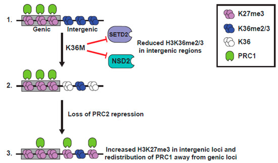 Model representing K36M mutant H3 function. Model derived from [11,93]. (1). K36M blocks function of SETD2 and NSD2, leading to reduction of K36me2/3. (2). In intergenic loci, reduction of H3K36me2 alleviates repression of PRC2, leading to increased intergenic K27me3. (3). Intergenic K27me3 recruits PRC1 away from genes, alleviating transcriptional silencing.