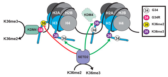 Another study interrogated the role of the histone G34R mutant in a context where it provided the sole source of histone H3 in the cell, facilitating the analysis of possible biological effects of the mutation. Yadav et al. modeled the G34R mutant in fission yeast and found a drop in both H3K36me3 and H3K36ac levels, while H3K36me2 accumulated on the mutant tail [109]. H3K27 methylation was not analyzed, as this mark does not exist in fission yeast, which lack the PRC2 complex. Further, H3G34R mutation caused a defect in response to the S-phase induced DNA damage, a defect in homologous recombination–mediated DNA damage repair, as well as genomic instability. It is not currently know which phenotypes are linked to which chromatin changes in this system, or if indeed such causal relationships can be established, since in fission yeast a single enzyme Set2 mediates all three levels of H3K36 methylation [110], making it difficult to tease out the effect of loss of just K36me3. Whilst the reduction in H3K36me3 is consistent with mammalian studies showing G34R-disrupts SETD2-mediated K36 tri-methylation, the accumulation of H3K36me2 indicates Set2 can still methylate the G34R mutant fission yeast H3 tail, and is consistent with ChIP studies showing that Set2 still associates with G34R mutant chromatin [109]. However, the reduction in K36me3 and accumulation of K36me2, suggests that either Set2-mediated di- to tri-methylation of H3K36 is blocked by G34R mutation, or alternately that an H3K36me3 demethylase is activated. Currently there are no structural studies of the fission yeast Set2 protein to help address whether G34R mutation affects the Set2 function, and there are no published in vitro methyltransferase assays on the mutant histone, using fission yeast Set2.