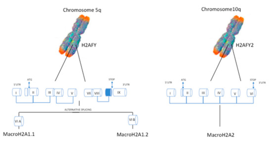 One example of histone variant proteins generated by alternative splicing is macroH2A1, which was described in 1992 by Pehrson et al. [20]. MacroH2A1 contains a domain that shows 66% homology with histone H2A and is conserved across various functionally unrelated proteins throughout the animal kingdom, vertebrates and some invertebrates [21]. This variant stands out because of its unique structure, whereby a C-terminal linker connects the histone fold domain to a macrodomain [22]. This macro domain protrudes from the compact nucleosome structure and likely affects the function and organization of the surrounding chromatin. Once in the nucleosome, macroH2A1 may contribute to different cellular processes, including cell cycle regulation, embryonic and adult stem cell differentiation, and DNA repair and transcription in somatic and cancer cells [23]. MacroH2A1 exists as two alternatively exon-spliced isoforms, macroH2A1.1 and macroH2A1.2 [24,25], while macroH2A2 is encoded by an independent gene (Figure 1).