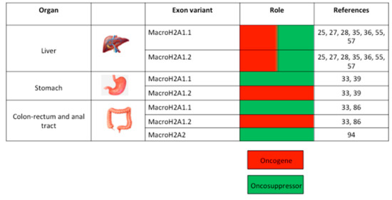 Epigenetic changes, including aberrant DNA methylation, are common events in GC initiation and progression [9]. Consequently, DNA methylation levels are emerging as promising biomarkers for early GC detection, prognosis, and development, and for predicting response to therapy [9]. Now, an active area of investigation is whether such epigenetic changes may be identified non-invasively using body fluid samples [10]. Other epigenetic alterations include histone modifications, histone variants, loss of genome imprinting, chromatin remodeling and the activity of non-coding RNAs, all of which are broadly associated with carcinogenesis in humans [11]. Histone variants—notably canonical histone H2A and H3—are increasingly appreciated to endow chromatin with unique properties. Such variants have important roles in regulating stem cell lineage commitment and reprogramming somatic cells to a state of pluripotency [12]. Changes in histone variant deposition onto chromatin affect tumorigenesis by modulating chromatin plasticity, genomic instability and cellular senescence, and triggering cancer-promoting gene expression pathways [12]. In this review, we summarize the current knowledge on the role of macroH2A histone family members as biomarkers and drivers of cancer pathogenesis in the GI tract.