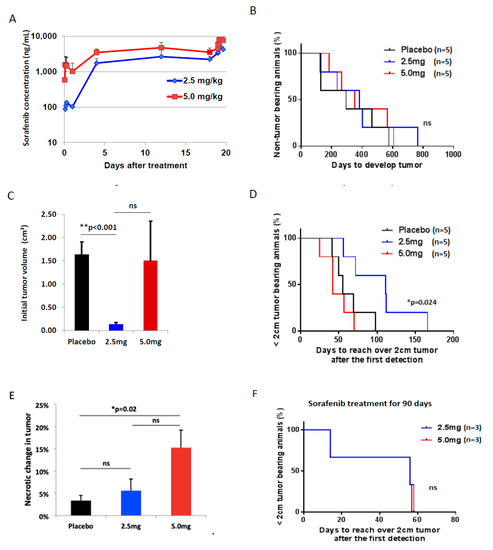 In vivo study with woodchuck hepatitis virus (WHV) infected woodchucks. (A) Graph plot of mean sorafenib concentration-time data for the low (2.5 mg/kg) and high (5 mg/kg) dose groups with a 5-days-on and 2-days-off schedule. (B) percent of non-tumor bearing animals after sorafenib treatment with different doses of sorafenib (n = 5), ns; not significant. (C) initial tumor volumes when tumor was detected for the first time, ** p < 0.001 by Student’s t-test, ns; not significant. (D) percent of less than 2 cm sized tumor bearing animals after the first tumor detection (n = 5), * p < 0.05 by Log-rank (Mantel-Cox) test. E, percent of necrotic change in tumor after tumor reached over 2 cm. (F) percent of less than 2 cm sized tumor bearing animals after a short-term (90 days) usage of 2.5mg/kg or 5.0 mg/kg sorafenib (n = 3), ns; not significant.