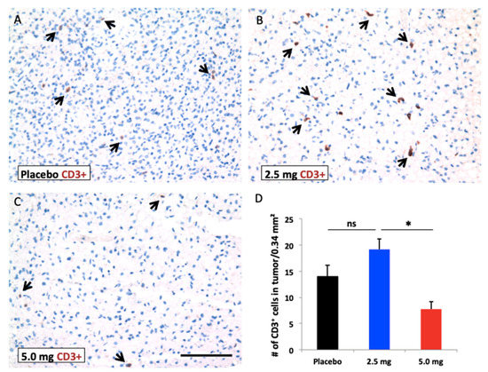 Immunohistochemistry with CD3 antibody. (A–C) representative photos after different doses of sorafenib treatment in the end of study (Arrow; CD3+ T cell). Scale bar: 100 μm. (D) numbers of CD3+ T cells in tumors (n = 3), * p < 0.05 by Student’s t-test, ns; not significant.