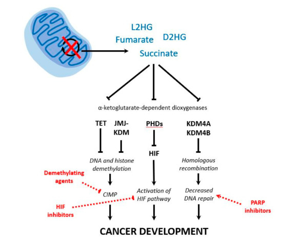Schematic representation of the consequences of tricarboxylic acid (TCA) cycle disruption in pheochromocytomas and paragangliomas (PPGL). Upon disruption of the activity of pivotal TCA cycle enzymes, there is an accumulation of metabolites (i.e., succinate, fumarate, D2HG and L2HG). Their efflux from the mitochondria to the cytosol and their subsequent competition with α-ketoglutarate lead to the inhibition of α-ketoglutarate-dependent dioxygenases involved in DNA and histone demethylation, regulation of HIF, and homologous recombination. As a result, different mechanisms are proposed as the cause of tumorigenesis in PPGL: aberrant global hypermethylation (CIMP), activation of the HIF pathway and decreased DNA repair. Finally, different therapeutic options may target each altered pathway: demethylating agents, HIF inhibitors, and poly-(ADP-ribose)-polymerase (PARP) inhibitors, respectively. D2HG: D-2-hydroxyglutarate; L2HG: L-2-hydroxyglutarate; TET: ten-eleven translocation DNA hydroxylase; JMJ: Jumonji; KDM: histone lysine demethylase; PHDs: prolyl hydroxylase domain-containing proteins; HIF: hypoxia-inducible factor; CIMP: CpG island methylation phenotype.