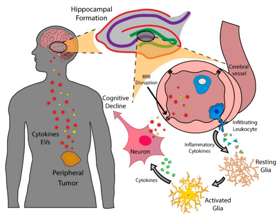 Advances in cancer treatments have greatly improved the overall survival of patients. However, the use of cancer therapies, including radiation, chemotherapy, and immunotherapies, are commonly associated with toxicities. A multitude of studies demonstrates that patients treated with systemic therapy or radiotherapy experience neurocognitive decline [1,2,3,4]. However, a new wave of research demonstrates that even prior to treatment, a significant portion of patients with non-CNS malignancies experience cognitive impairment [5,6]. Furthermore, patients with cancer cachexia frequently experience cognitive decline, suggesting tumor factors chronically affect cognition throughout the disease course. With 1.7 million new cases of cancer in 2018 in the US alone and due to an aging population, the prevalence of cancer is on the rise as is the population of patients in remission or cured of disease [7]. Consequently, as patients continue to live longer after their cancer is cured, the focus is shifting towards understanding long-term sequelae caused by cancer therapeutics or surgery, and special attention to the quality of life measurements has become paramount for patient care. While much of the focus is centered around mitigating therapy-related toxicities, there is a paradoxical under-appreciation of inherent cancer-related toxicities. The precise mechanisms by which peripheral tumors communicate to the CNS to cause cognitive and behavioral change remain elusive, but almost certainly consist of a complex interplay between the immune system, genetic factors, host behavior, and psychosocial state.