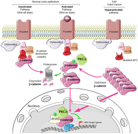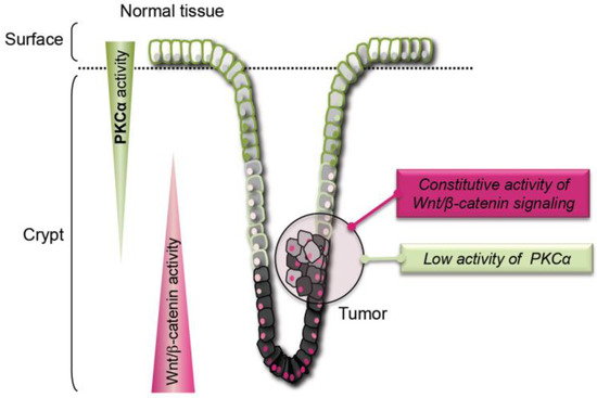 No therapy targeting the activity of the Wnt/β-catenin pathway is currently used to treat CRC, partly due to the lack of targets downstream of APC. However, several observations indicate that Protein Kinase C-α (PKCα) might fulfill this criterion. PKCα is a member of the Protein Kinase C (PKC) family that includes ten serine/threonine kinases encoded by nine distinct genes. The first members were isolated 41 years ago from mammalian brain extracts [7] and rapidly became the subject of intensive research in the cancer field due to their ability to be directly activated by phorbol ester tumor promoters [8]. However, despite more than 6000 citations linking PKC to cancer in PubMed (https://www.ncbi.nlm.nih.gov/pubmed), PKC role as oncogenes or tumor suppressors has been the subject of discussion for a long time. This could be one of the main reasons why PKC is not considered to be a prime target for cancer therapy. Significant evidence indicates that PKCα acts as a tumor suppressor in intestinal epithelial cells: (i) PKCα inactivating mutations have been detected in CRC [9]; (ii) PKCα expression is frequently decreased in human CRC and its down-regulation induces intestinal tumorigenesis in mouse models [10,11]; (iii), decreased PKCα expression promotes CRC cell growth and tumorigenicity [12]; (iv) PRKCA (the gene encoding mouse PKCα) knock-out in mice is associated with the development of spontaneous intestinal polyps, and with higher tumor aggressiveness and reduced survival in the APCMin/+ background [11]; and (v) PKCα activity significantly reduces CRC cell invasion and growth [13]. Therefore, PKCα can exert its tumor suppressor activity in the intestinal epithelium by antagonizing the activity of the Wnt/β-catenin signaling pathway. Indeed, PKCα activity is inversely correlated with that of the Wnt/β-catenin pathway: it gradually increases from the cryptic compartment to the surface of normal intestinal epithelium, while it is significantly reduced in CRC in which the Wnt/β-catenin signaling pathway is constitutively activated (Figure 1) [10,14,15,16,17]. Two studies clearly described two distinct mechanisms by which PKCα can inhibit the Wnt/β-catenin pathway activity by targeting the β-catenin transducer, downstream of APC (Figure 2). Lee et al. (2010) [18] reported that PKCα-induced phosphorylation of the orphan receptor RORα results in β-catenin co-transcriptional activity inhibition and in the trans-repression of Wnt/β-catenin target genes. Gwak et al. (2006) [19] demonstrated that PKCα-induced phosphorylation of β-catenin promotes β-catenin ubiquitination and degradation by the proteasome.