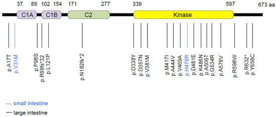 Non-silent PKCα mutations identified in both small intestine and colon tumors. (http://cancer.sanger.ac.uk/cosmic). p: protein sequence as the reference sequence; fs: shift of the reading frame. *: insertion of a stop codon.