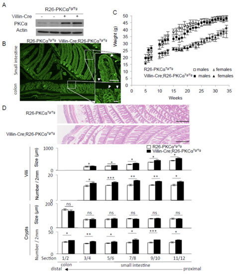 Four males and four females R26-PKCαTg/Tg and villin-Cre;R26-PKCαTg/Tg littermates were monitored and weighted weekly from weaning to 34 weeks post-partum. Whole intestines of 14- and up to 76-week-old mice were collected, fixed as rolls, and embedded in paraffin. Then, 3 μm thick tissue sections were stained with hematoxilin and eosin (H&E) and processed for immunofluorescence analysis of PKCα expression. H&E-stained tissue sections were scanned (×20 magnification) using the Nanozoomer technology (Hamamatsu Photonics France, Massy, France). The number of villi and crypts in 2 μm was counted in each intestinal section (n = 4 areas per section) and their size (n = 10 per section) was calculated using the NDP.view2 software (version U12388-1, Hamamatsu city, Japan). Fresh intestinal epithelium was also collected by scraping the mice inner intestinal layer and frozen for western blot analysis.