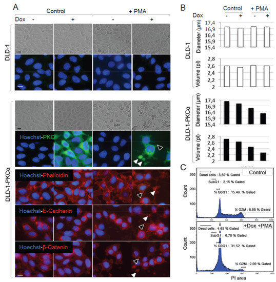 In CRC cells, PKCα inhibits Wnt/β-catenin signaling activity downstream of APC [18,19]. To determine whether stimulating PKCα function in CRC cells with mutated APC inhibited cell growth, we generated a DLD-1 CRC cell line in which PKCα overexpression is induced by incubation with doxycycline (DLD-1-PKCα cell line). PKCα was weakly detected in parental DLD-1 cells (Figure 5A, upper panel) and in DLD-1-PKCα cells which were not exposed to doxycycline (Figure 5A, lower panel), in agreement with the low endogenous PKCα levels in CRC cells. Upon exposure to doxycycline for 24 h, exogenous PKCα expression increased in DLD-1-PKCα cells and accumulated in the cytoplasm, but not at the plasma membrane (Figure 5A, lower panel). This observation suggests that overexpressed PKCα is not activated, and that increasing PKCα expression is not sufficient to induce PKCα function in DLD-1 CRC cells. Incubation with 1 nM of phorbol 12-myristate 13-acetate (PMA; the prototypic phorbol ester) [8] did not have significant effects in both DLD-1 and DLD-1-PKCα cells, which is in agreement with the low endogenous PKC levels in CRC cells. Conversely, incubation of DLD-1-PKCα cells with 1 μg/mL doxycycline and 1 nM PMA for 24 h induced the translocation of overexpressed PKCα to the plasma membrane (Figure 5A, lower panel), formation of membrane protrusions (empty arrowhead) and disruption of DLD-1 cell morphology with large buds (solid arrowheads). These changes were associated with a drastic remodeling of the actin network (Figure 5A, lower panels, phalloidin staining), relocation of actin, E-cadherin and β-catenin into membrane protrusions and large buds (Figure 5A, lower left panels, black and solid arrowheads), decrease of the cell size (Figure 5B), and cell cycle arrest in the G0/G1 phase (Figure 5C), as previously reported in colon cancer cell lines including DLD-1 cells [12,13,24,25,26,27]. This phenotype correlated with inhibition of the activity of the Wnt/β-catenin pathway, as indicated by the decrease of TOPflash luciferase reporter activity measured in DLD-1-PKCα cells incubated with both PMA and doxycycline compared with untreated cells (Figure S2). We obtained similar results upon overexpression of stabilized S33β-catenin, a dominant-positive mutant of β-catenin where serine 33 is mutated into tyrosine that prevents β-catenin degradation [28]. In addition, western blot experiments (Figure S3) evidenced a decrease in active β-catenin. Since activating PKCα function and inhibiting the Wnt/β-catenin signaling both cause cell cycle arrest in the G1 phase (Figure 4C and [29]), we conclude that PKCα-induced colon cancer cells growth arrest is mediated through inhibition of the Wnt/β-catenin signaling. However, we cannot exclude the involvement of additional mechanisms.