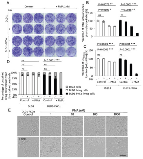 To evaluate the effects of sustained PKCα activity on CRC cell growth capacity, we cultured parental DLD-1 and DLD-1-PKCα cells at very low concentration (1000 cells/10 cm dish) in the presence or absence of 1 μg/mL doxycycline and/or 1 nM PMA. After 10 days, we stained cultures with crystal violet (Figure 6A), and quantified the growth capacity in the different conditions by calculating the variation of the total area occupied by the clones (Figure 6B) and of the Optical Density at 570 nm (OD570 nm) relative to untreated cells (control) (Figure 6C). The results clearly demonstrated that (doxycycline + PMA)-induced PKCα expression and activity in DLD-1-PKCα cells inhibited cell growth by more than 80%. Moreover, quantification of dead cells after trypan blue staining indicated that (doxycycline + PMA)-induced PKCα expression/activity promoted cell death (about 75% of dead cells compared with 10–30% in controls) (Figure 6D). Incubation of DLD-1-PKCα cells with 1 μg/mL doxycycline and increasing concentrations of PMA for 24 h showed that the extent of cell death was PMA dose-dependent (phase contrast images in Figure 6E, lower panels).