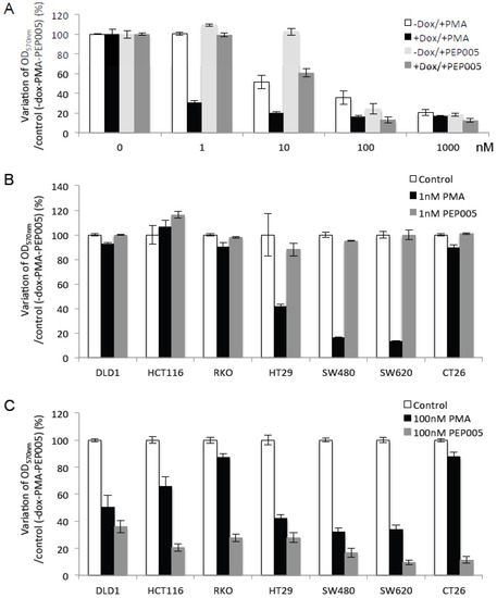 The previous results demonstrated that doxycycline-induced PKCα overexpression inhibits CRC cell growth and promotes their death upon PMA stimulation. Although PKCα is infrequently mutated in CRC cells, it has been reported that PKCα expression is decreased in CRC [30], raising the question of whether PKCα overexpression and drug-induced activation are sufficient to induce its tumor suppressor function. Moreover, the isozyme specificity of PKC activators is questionable. Indeed, PKC activators interact with the DAG binding site that is located in the highly conserved C1 domain of classical (α, βI, βII, γ) and novel (δ, ε, θ, η) PKC isoforms. Consequently, none of the available PKC activators is highly selective for a specific isoform. The di-terpene ester PEP005 shows preferential selectivity for PKCα and δ and induces growth arrest of some CRC cell lines, such as HT29 and Colo205 cells [31,32]. In agreement, crystal violet staining of DLD-1-PKCα cells incubated with increasing concentrations of PMA or PEP005 in the presence or not of doxycycline for 10 days clearly demonstrated that like PMA, PEP005 inhibited DLD-1 cell growth in a concentration- and a PKCα-dependent manner, although the required concentrations were 10 times higher than those for PMA (Figure 7A). In control conditions (without doxycycline), PMA inhibited the growth of DLD-1-PKCα cells from 10 nM and PEP005 from 100 nM. Conversely, in doxycycline-treated cells to induce PKCα overexpression, cell growth was inhibited by both compounds at ten times lower concentrations (Figure 7A). Moreover, in a panel of CRC cell lines, PMA and PEP005 inhibited cell growth with different potencies. PMA strongly inhibited CRC cell growth from 1 nM, but only in a limited number of cell lines (HT29, SW480, SW620) (Figure 7B). All PMA-sensitive CRC cell lines (HT29, SW480, SW620) displayed a Microsatellite Stable (MSS) status while the others (DLD-1, HCT116, RKO and CT26) exhibited a Microsatellite Instable (MSI) status. Conversely, PEP005 did not have any effect at 1 nM whatever the cell line (Figure 7B), but was significantly more efficient than PMA at 100 nM and in all tested CRC cell lines (Figure 7C). These findings suggest that di-terpene esters are natural compounds with clinical interest for CRC treatment.