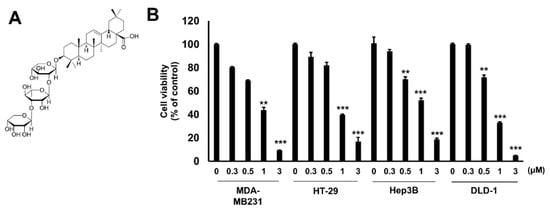 Huzhangoside A (Hu.A) decreased the cell viability of several cancer cell lines. (A) Chemical structure of Hu.A was indicated. (B) The indicated cells were treated with Hu.A for 24 h and 3-(4,5-dimethylthiazol-2-yl)-2,5-diphenyltetrazolium bromide (MTT) assay was performed. The cell viability is shown as mean ± standard deviations (SD). **, p < 0.01 and ***, p < 0.001 compared with control.