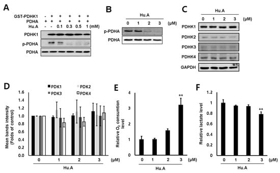 The cytotoxic effect of Hu.A in several human cancer cell lines, including MDA-MB-231, HT-29, Hep3B, and DLD-1 cells, was examined by 3-(4,5-dimethylthiazol-2-yl)-2,5-diphenyltetrazolium bromide (MTT) assay. The viability of these cells was significantly reduced upon Hu.A treatment (Figure 1B). The growth of LLC cells also decreased upon treatment with Hu.A (Supplementary Figure S1A). To investigate whether Hu.A has an inhibitory effect on the kinase activity of PDHK1, we performed an in vitro kinase assay using glutathione S-transferase (GST)-conjugated-PDHK1 and recombinant PDHA protein. In the Hu.A containing samples, the kinase activity of GST-PDHK1 was significantly inhibited (Figure 2A). The intracellular PDHK1 activity was measured using phospho-PDHA levels as a marker. We found that Hu.A treatment also inhibited the PDHK1 activity in DLD-1 and LLC cells (Figure 2B, and Supplementary Figure S1B). We also confirmed the protein expression of all these isozymes. The protein levels of these isozymes were very low and did not significantly change upon Hu.A treatment (Figure 2C,D). Since the inhibition of PDHK activity promotes the OXPHOS [18], we measured the O2 consumption rate and lactate production level upon Hu.A treatment. The O2 consumption rate was found to be increased and the secretory lactate levels in media were reduced upon Hu.A treatment in DLD-1 cells, as expected (Figure 2E,F).