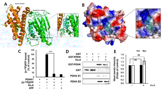 Hu.A interacted with the ATP-binding pocket of PDHK1. (A) The modeled structure of PDHK1 (PDB ID: 2Q8F) with Hu.A (CID: 73347426) around the ATP-binding domain is shown as a ribbon representation. The interaction residues between PDHK1 and Hu.A are shown, and hydrogen bonds are shown as black dotted lines. (B) The complex structure of PDHK1 with Hu.A was predicted as a surface representation. The relative distribution of the electrostatic surface of PDHK1 is shown with the acidic region in red, basic region in blue, and neutral region in white. (C) ATP-binding assay of PDHK1 in the presence or absence of Hu.A is shown. [α-32P]ATP-bound values were measured using scintillation counter. The results were calculated as percentage values in comparison to control and shown as mean ± SD. ***, p < 0.01 compared with positive control group (2nd lane). (D) PDC subunits and PDHK-binding assay was performed. (E) The bands intensity of panel (D) was indicated. The data are indicated as mean ± SD. NS, not significant.