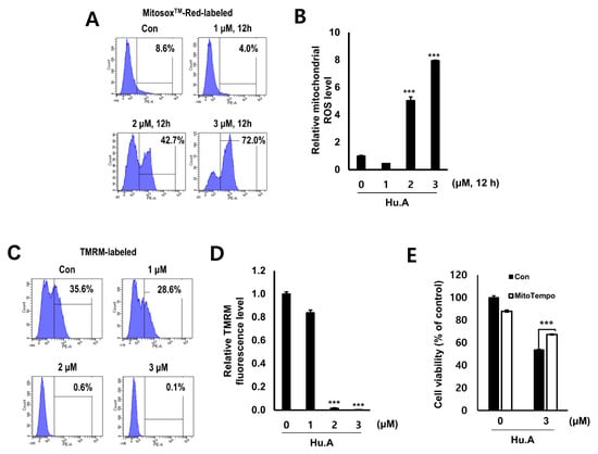 Hu.A induced mitochondrial reactive oxygen species (ROS) production and mitochondrial damage in DLD-1 cells. DLD-1 cells were treated with Hu.A for indicated time points in serum-free condition. The cells were stained with MitoSOX™ (Thermo Fisher Scientific, Rockford, IL, USA) Red (A and B), and tetramethylrhodamine methyl ester (TMRM) (C and D). The fluorescence for both assays was measured by FACS analysis. The relative mitochondrial ROS and TMRM fluorescence levels were calculated to determine the fold difference in comparison to control and are shown as mean ± SD. ***, p < 0.001. (E) In the serum-free condition, the cells were pre-treated with MitoTEMPO (Sigma-Aldrich, St. Louis, MO, USA) (50 μM) for 1 h and treated with 3 μM of Hu.A for 6 h. MTT assay was then performed. Data are indicated as mean ± SD. ***, p < 0.001 compared with the only Hu.A-treated group and MitoTEMPO with Hu.A co-treated group.